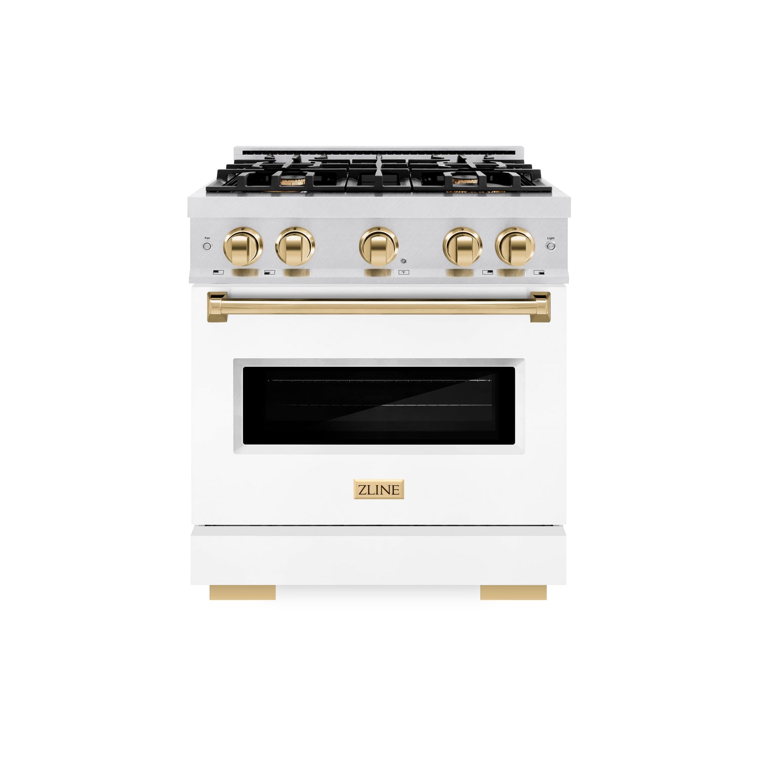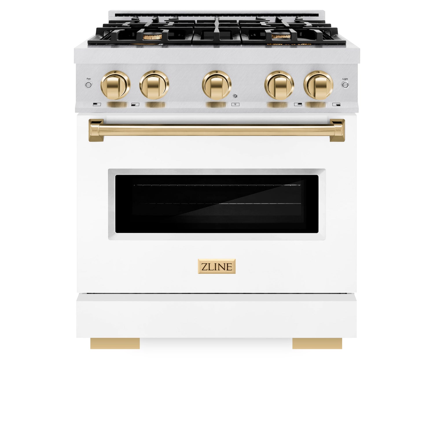 ZLINE Autograph Edition 30 in. 4.2 cu. ft. Classic Gas Range with 4 Burner Cooktop and Convection Gas Oven in Satin Stainless Steel with White Matte Door and Polished Gold Accents (CGRSZ-WM-30-G)