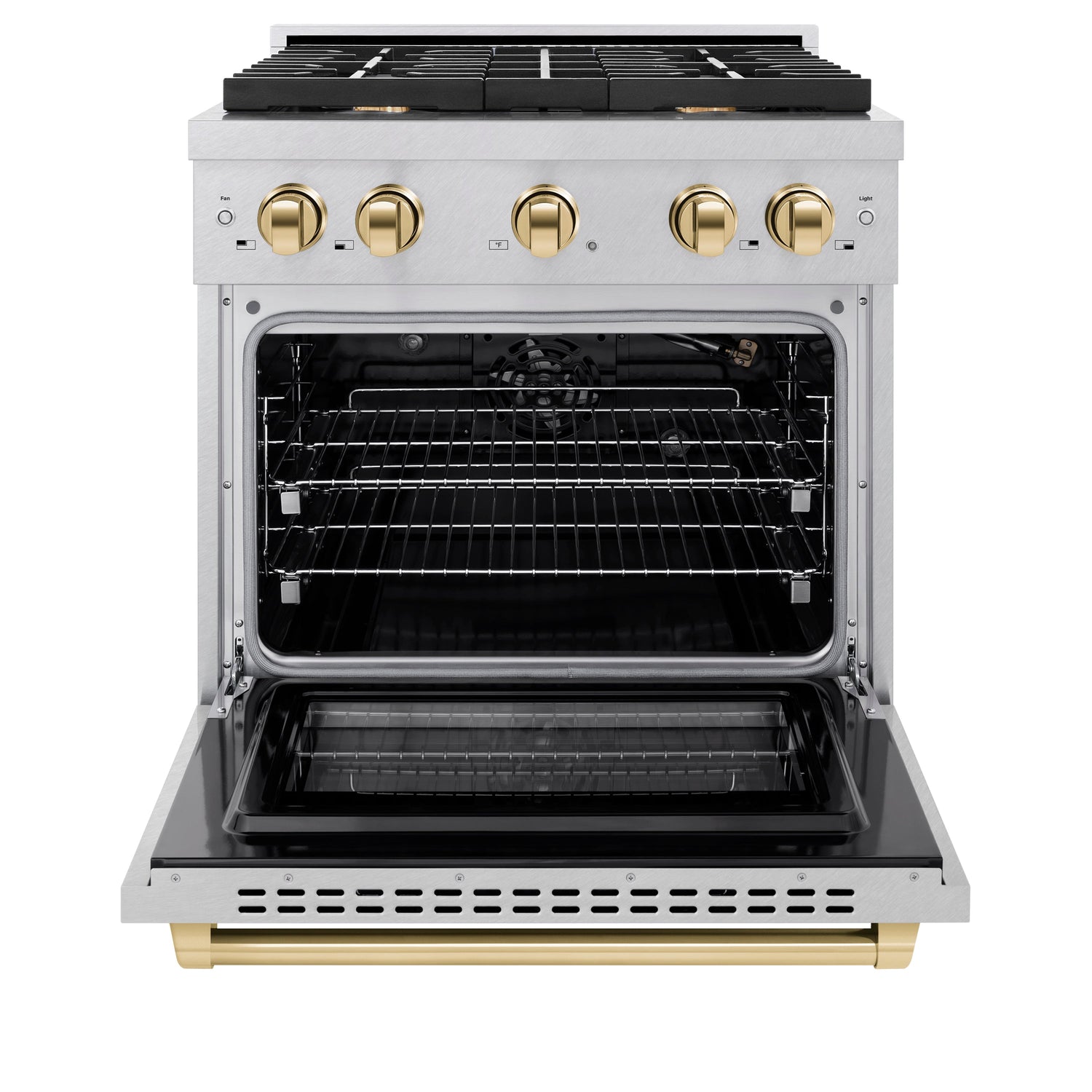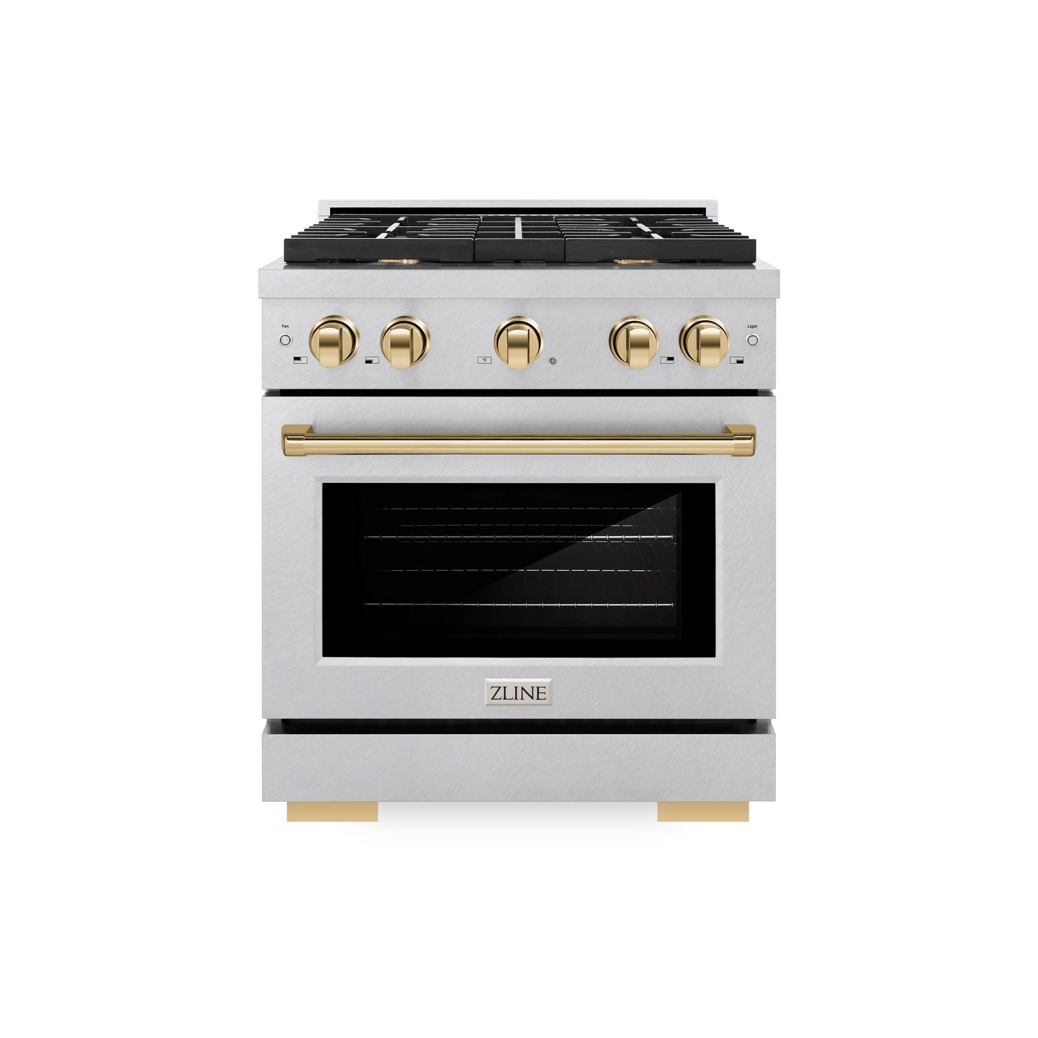 Luxury isn’t meant to be left desired—it’s meant to be attainable. The ZLINE Autograph Edition 30 in. 4.2 cu. ft. Paramount Gas Range with 4 Burner Cooktop and Convection Gas Oven in Satin Stainless Steel and Polished Gold Accents (SGRSZ-30-G) features a versatile gas cooktop with 4 Italian-made auto-reignition burners, a high-performing gas convection oven, enhanced cast iron grates, a Horizon oven door window design, and elegant polished gold knobs and handle allowing you to master every meal. With a modern, timeless style and refined functionality, ZLINE Paramount Gas Ranges are masterfully crafted to deliver an elevated culinary experience.