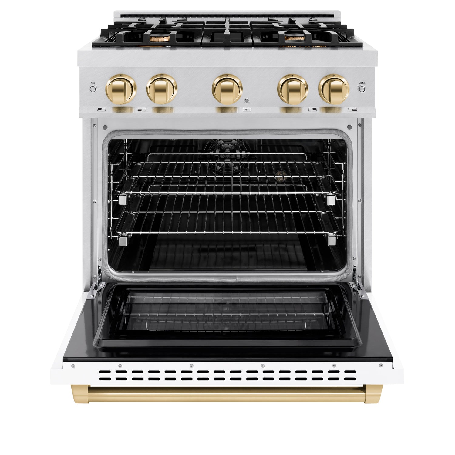 Luxury isn’t meant to be left desired—it’s meant to be attainable. The ZLINE Autograph Edition 30 in. 4.2 cu. ft. Select Dual Fuel Range with 4 Burner Gas Cooktop and Electric Convection Oven in Satin Stainless Steel with White Matte Door and Polished Gold Accents (HDRSZ-WM-30-G) combines the elegance of a hand-finished porcelain gas cooktop with 4 Italian-made auto-reignition burners, an electric convection oven with an energy-efficient cooling fan to ensure quiet operation, a beautiful white matte door with a Horizon window design, and stunning polished gold knobs and handle allowing you to master every meal. With a modern, timeless style and refined functionality, ZLINE Select Dual Fuel Ranges are masterfully crafted to deliver an elevated culinary experience.