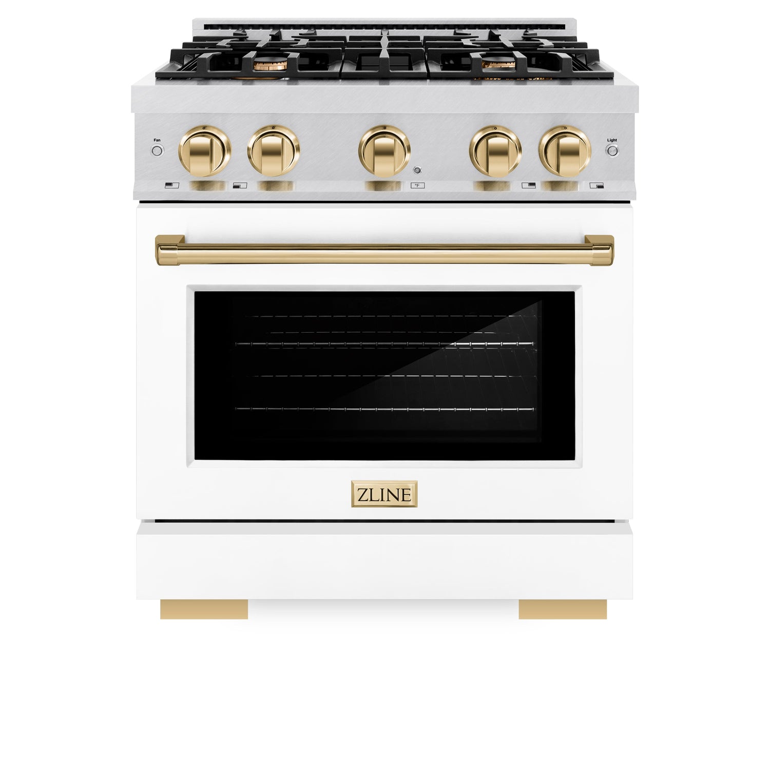 ZLINE Autograph Edition 30 in. 4.2 cu. ft. Select Dual Fuel Range with 4 Burner Gas Cooktop and Electric Convection Oven in Satin Stainless Steel with White Matte Door and Polished Gold Accents (HDRSZ-WM-30-G)