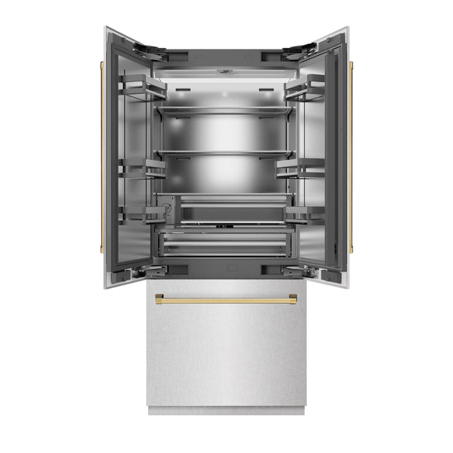 ZLINE Autograph Edition 36 in. 19.6 cu. ft. French Door Built-In Bottom Freezer Refrigerator with Water Dispenser and Ice Maker in Satin Stainless Steel with Stainless Steel Interior and Polished Gold Accents (SRBIVZ-SN-36-G)