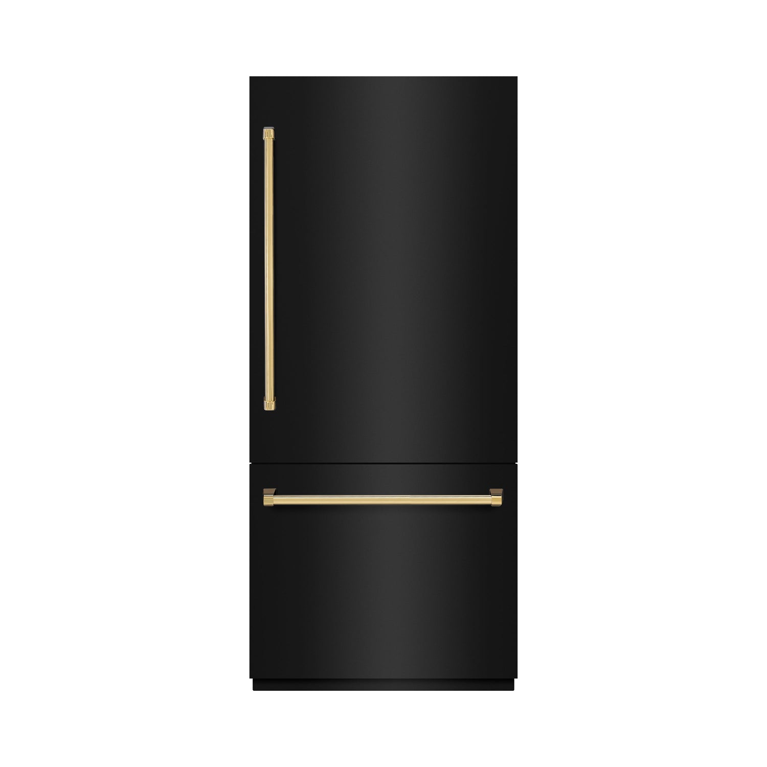 ZLINE Autograph Edition 36 in. 19.8 cu. ft. Built-In Bottom Freezer Refrigerator with Water Dispenser and Ice Maker in Black Stainless Steel with Graphite Gray Interior and Polished Gold Accents (GRBITZ-BS-36-G)