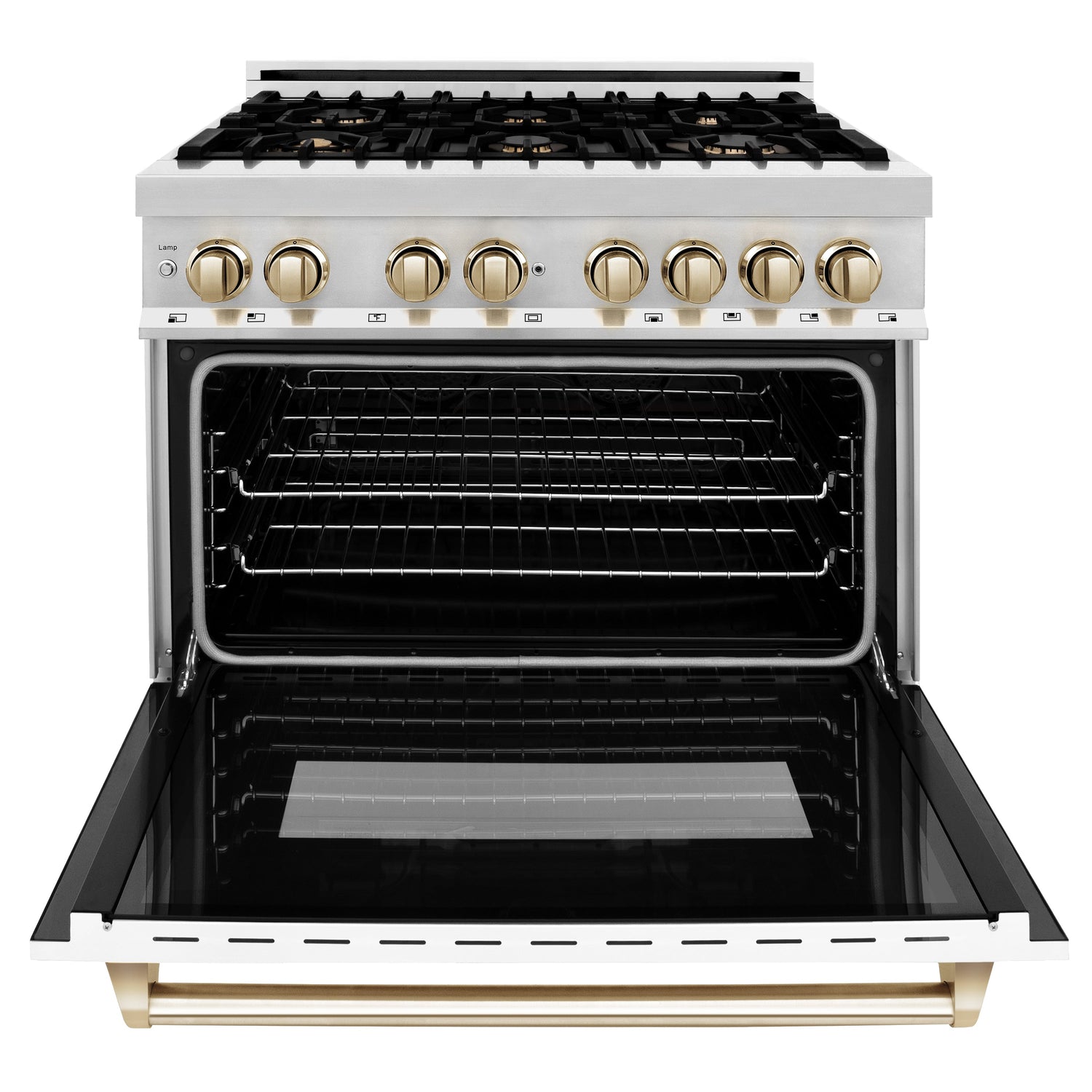 ZLINE Autograph Edition 36 in. 4.6 cu. ft. Legacy Dual Fuel Range with 6 Burner Gas Cooktop and Electric Convection Oven in Stainless Steel with White Matte Door and Polished Gold Accents (RAZ-WM-36-G)