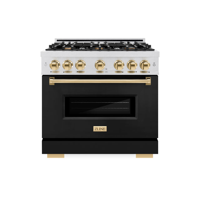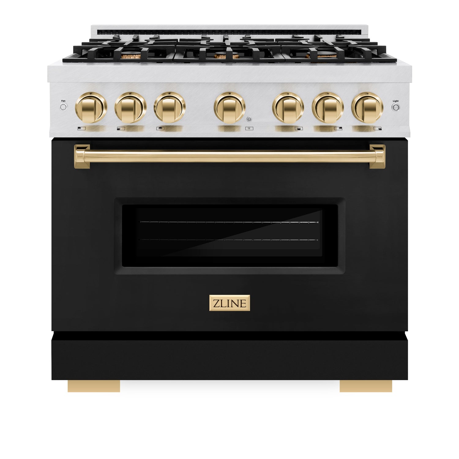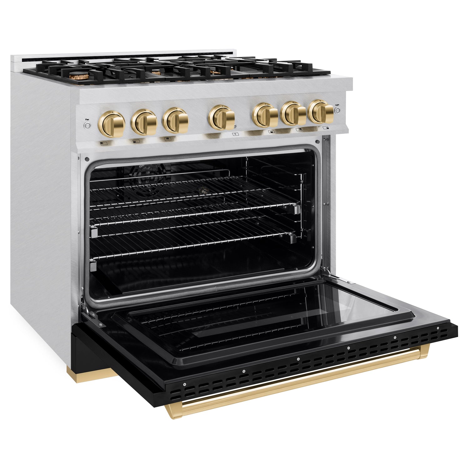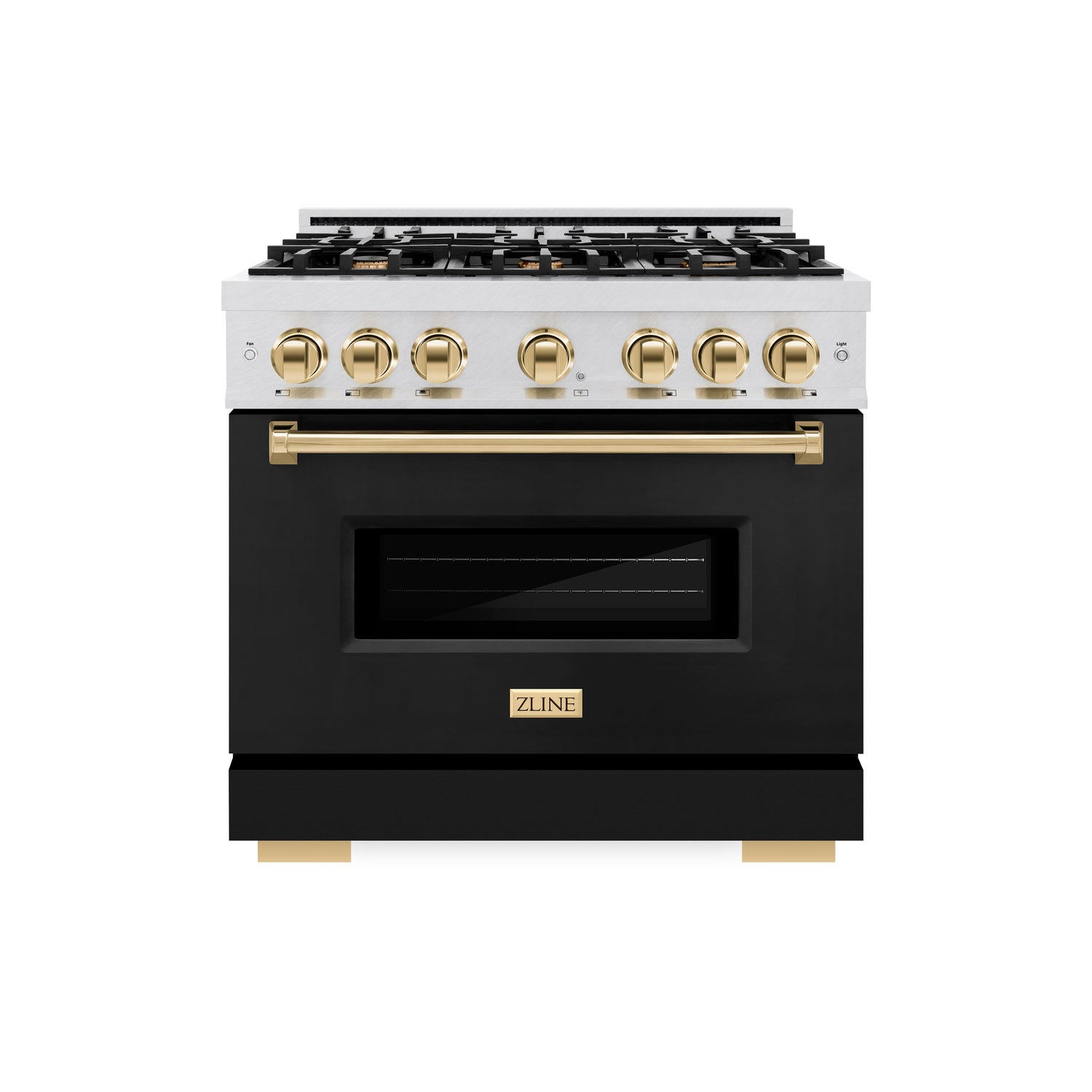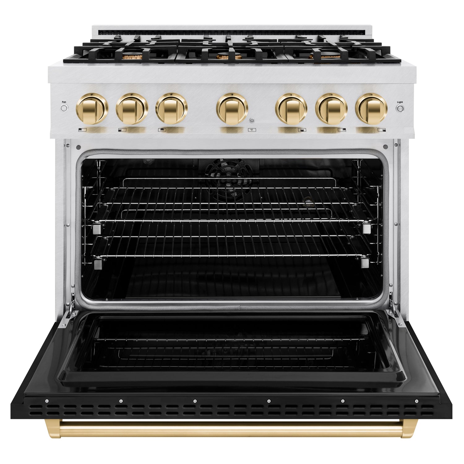 ZLINE Autograph Edition 36 in. 5.2 cu. ft. Classic Dual Fuel Range with 6 Burner Gas Cooktop and Electric Convection Oven in Satin Stainless Steel with Black Matte Door and Polished Gold Accents (CDRSZ-BLM-36-G)