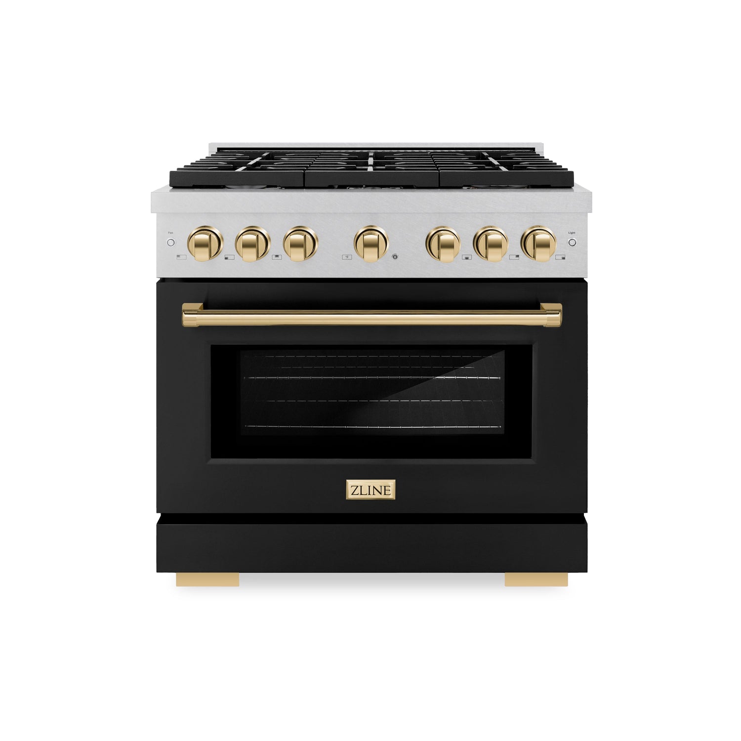 ZLINE Autograph Edition 36 in. 5.2 cu. ft. Paramount Gas Range with 6 Burner Cooktop and Convection Gas Oven in Satin Stainless Steel with Black Matte Door and Polished Gold Accents (SGRSZ-BLM-36-G)