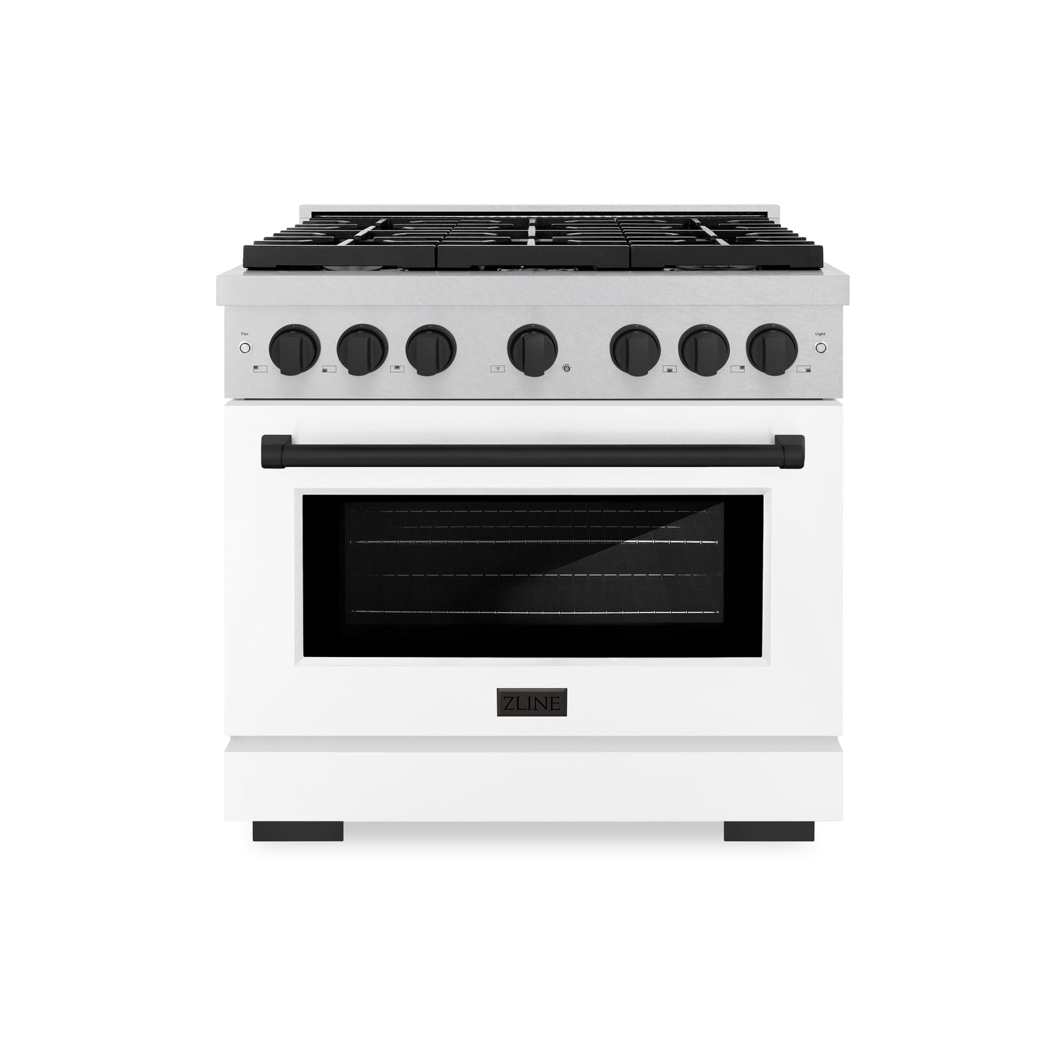 ZLINE Autograph Edition 36 in. 5.2 cu. ft. Paramount Gas Range with 6 Burner Cooktop and Convection Gas Oven in Satin Stainless Steel with White Matte Door and Matte Black Accents (SGRSZ-WM-36-MB)