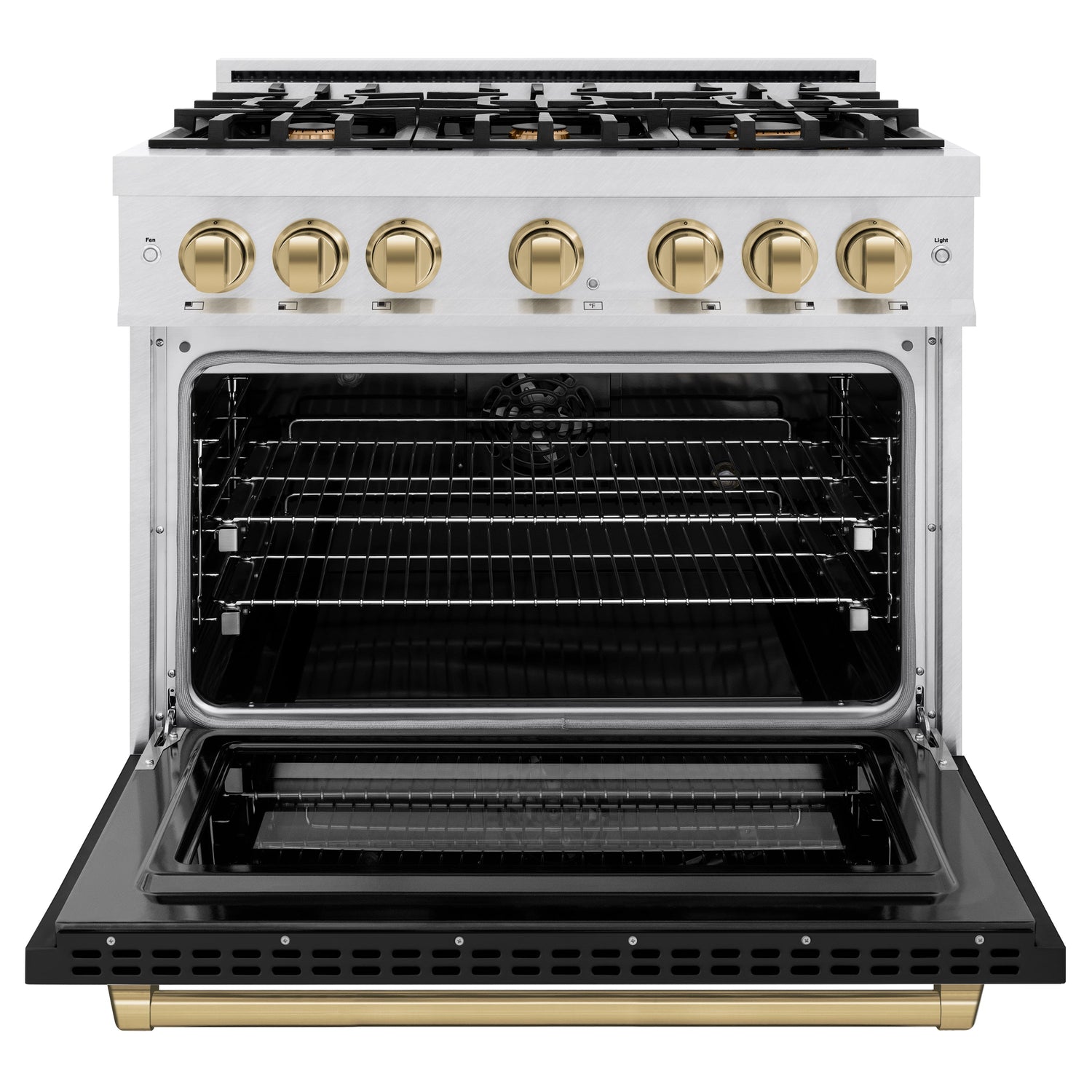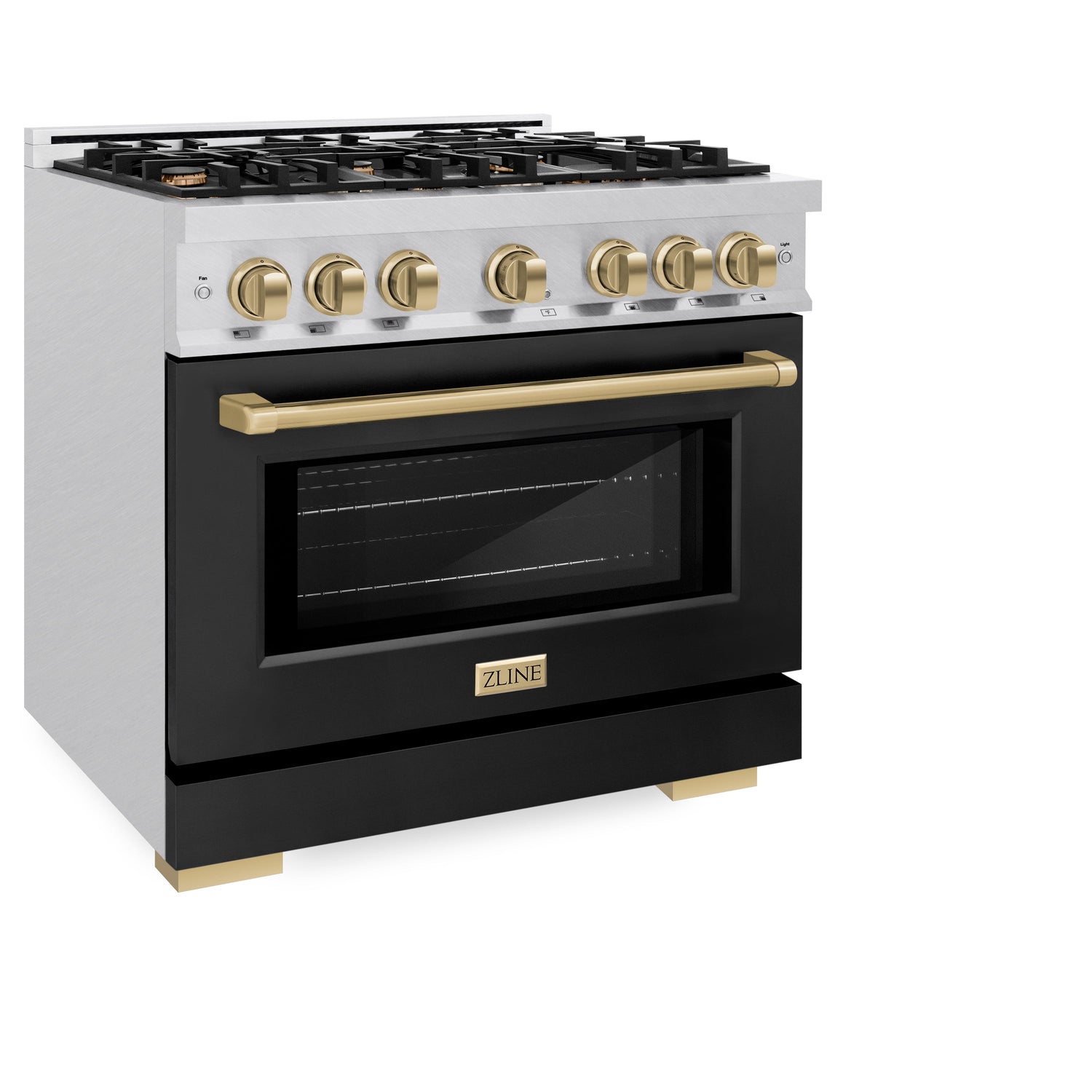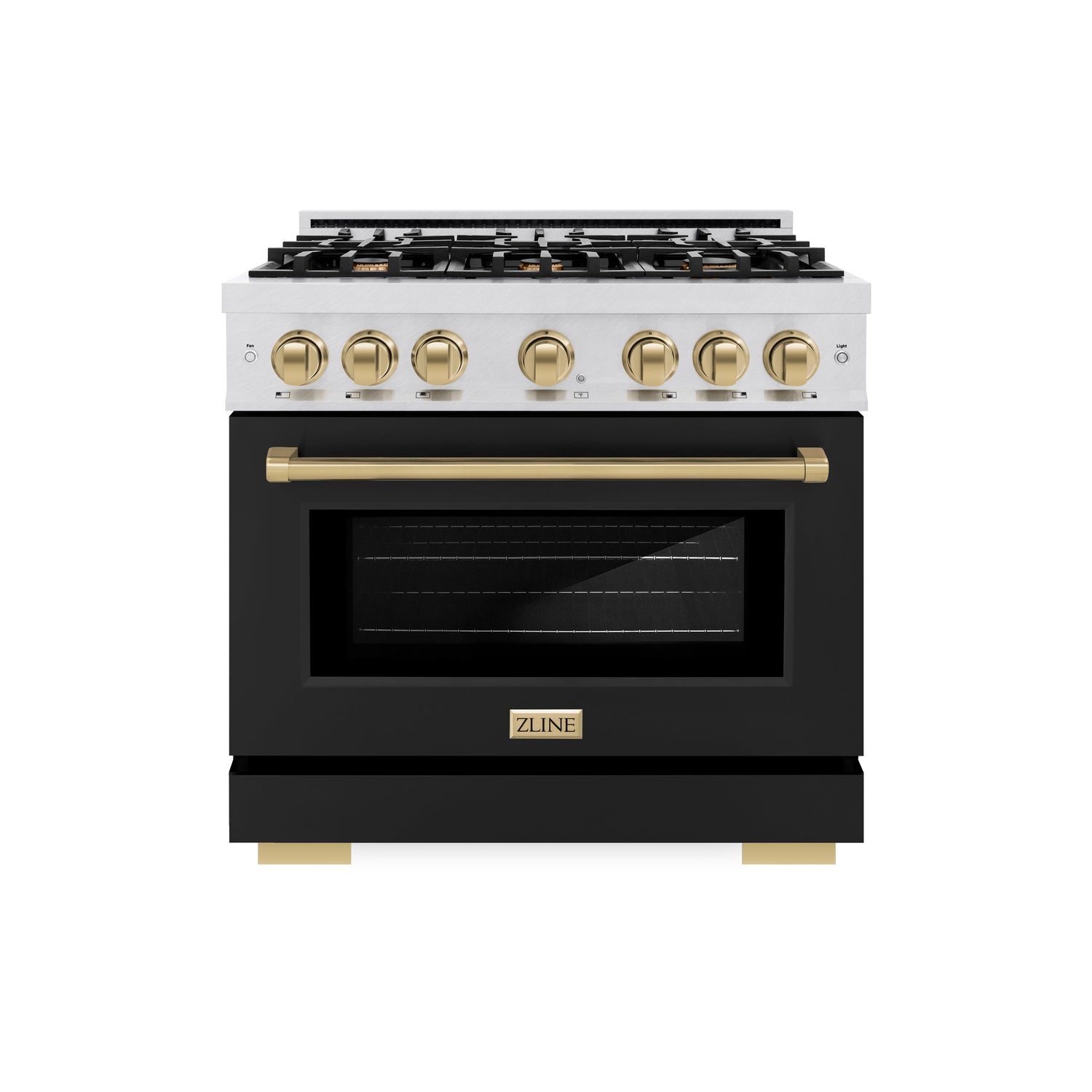 Luxury isn’t meant to be left desired—it’s meant to be attainable. The ZLINE Autograph Edition 36 in. 5.2 cu. ft. Select Dual Fuel Range with 6 Burner Gas Cooktop and Electric Convection Oven in Satin Stainless Steel with Black Matte Door and Champagne Bronze Accents (HDRSZ-BLM-36-CB) combines the elegance of a hand-finished porcelain gas cooktop with 6 Italian-made auto-reignition burners, an electric convection oven with an energy-efficient cooling fan to ensure quiet operation, a beautiful black matte door with a Horizon window design, and stunning champagne bronze knobs and handle allowing you to master every meal. With a modern, timeless style and refined functionality, ZLINE Select Dual Fuel Ranges are masterfully crafted to deliver an elevated culinary experience.