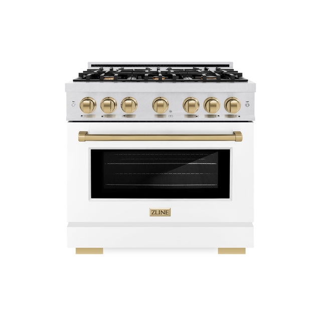 ZLINE Autograph Edition 36 in. 5.2 cu. ft. Select Dual Fuel Range with 6 Burner Gas Cooktop and Electric Convection Oven in Satin Stainless Steel with White Matte Door and Champagne Bronze Accents (HDRSZ-WM-36-CB)