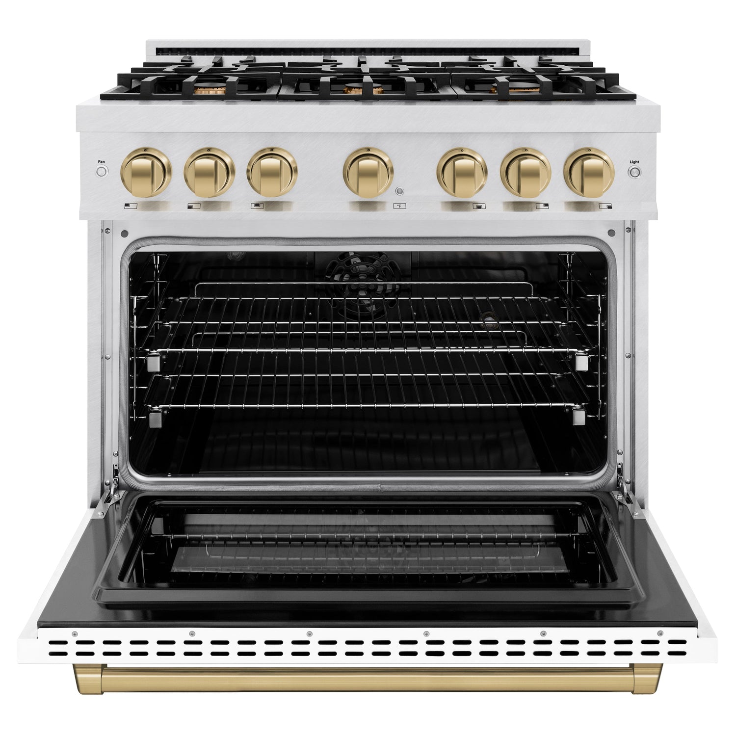 Luxury isn’t meant to be left desired—it’s meant to be attainable. The ZLINE Autograph Edition 36 in. 5.2 cu. ft. Select Dual Fuel Range with 6 Burner Gas Cooktop and Electric Convection Oven in Satin Stainless Steel with White Matte Door and Champagne Bronze Accents (HDRSZ-WM-36-CB) combines the elegance of a hand-finished porcelain gas cooktop with 6 Italian-made auto-reignition burners, an electric convection oven with an energy-efficient cooling fan to ensure quiet operation, a beautiful white matte door with a Horizon window design, and stunning champagne bronze knobs and handle allowing you to master every meal. With a modern, timeless style and refined functionality, ZLINE Select Dual Fuel Ranges are masterfully crafted to deliver an elevated culinary experience.