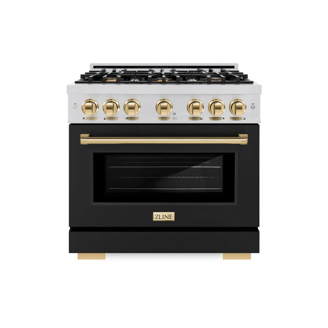 ZLINE Autograph Edition 36 in. 5.2 cu. ft. Select Dual Fuel Range with 6 Burner Gas Cooktop and Electric Convection Oven in Stainless Steel with Black Matte Door and Polished Gold Accents (HDRZ-BLM-36-G)