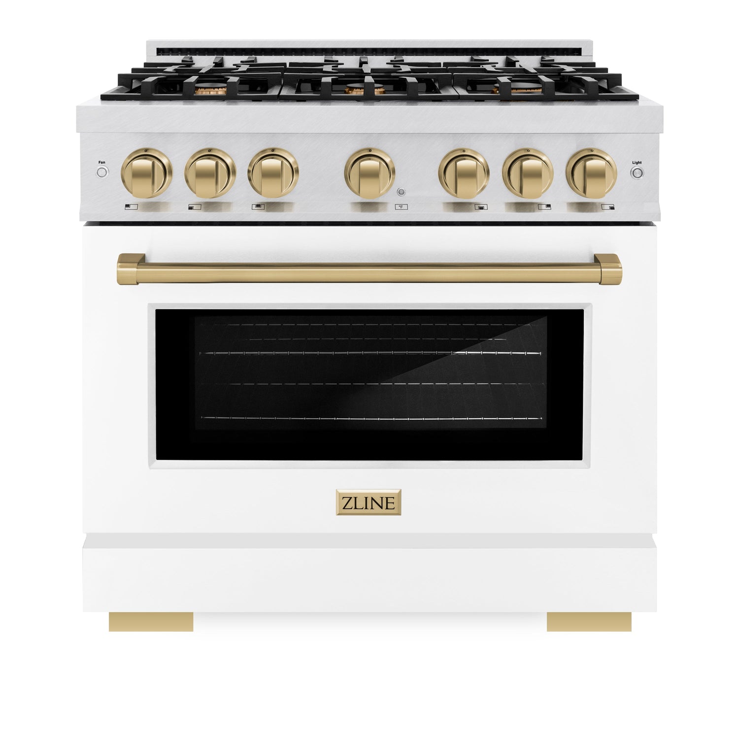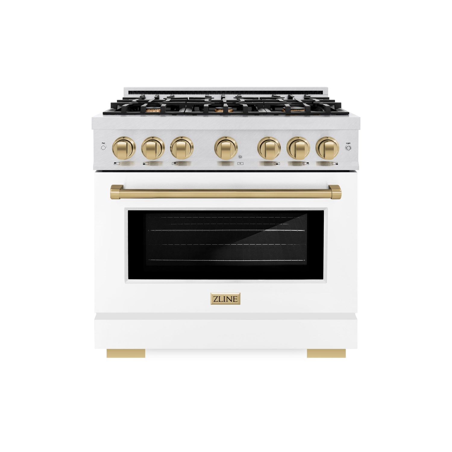 ZLINE Autograph Edition 36 in. 5.2 cu. ft. Select Gas Range with 6 Burner Cooktop and Convection Gas Oven in Satin Stainless Steel with White Matte Door and Champagne Bronze Accents (HGRSZ-WM-36-CB)