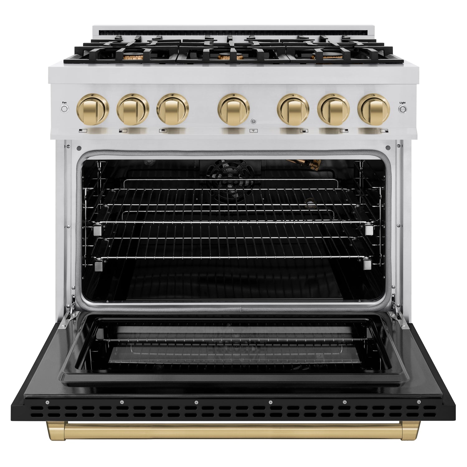 Luxury isn’t meant to be desired - it’s meant to be attainable. The ZLINE Autograph Edition 36 in. 5.2 cu. ft. Select Gas Range with 6 Burner Cooktop and Convection Gas Oven in Stainless Steel with Black Matte Door and Champagne Bronze Accents (HGRZ-BLM-36-CB) combines the elegance of a hand-finished porcelain gas cooktop with 6 Italian-made auto-reignition burners, a gas convection oven with an energy-efficient cooling fan to ensure quiet operation, a beautiful black matte door with a Horizon window design, and stunning champagne bronze knobs and handle allowing you to master every meal. With a modern, timeless style and refined functionality, ZLINE Select Gas Ranges are masterfully crafted to deliver an elevated culinary experience.
