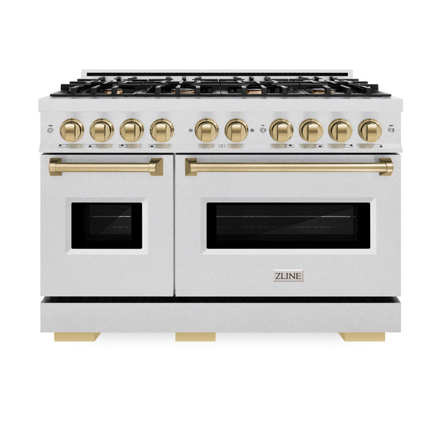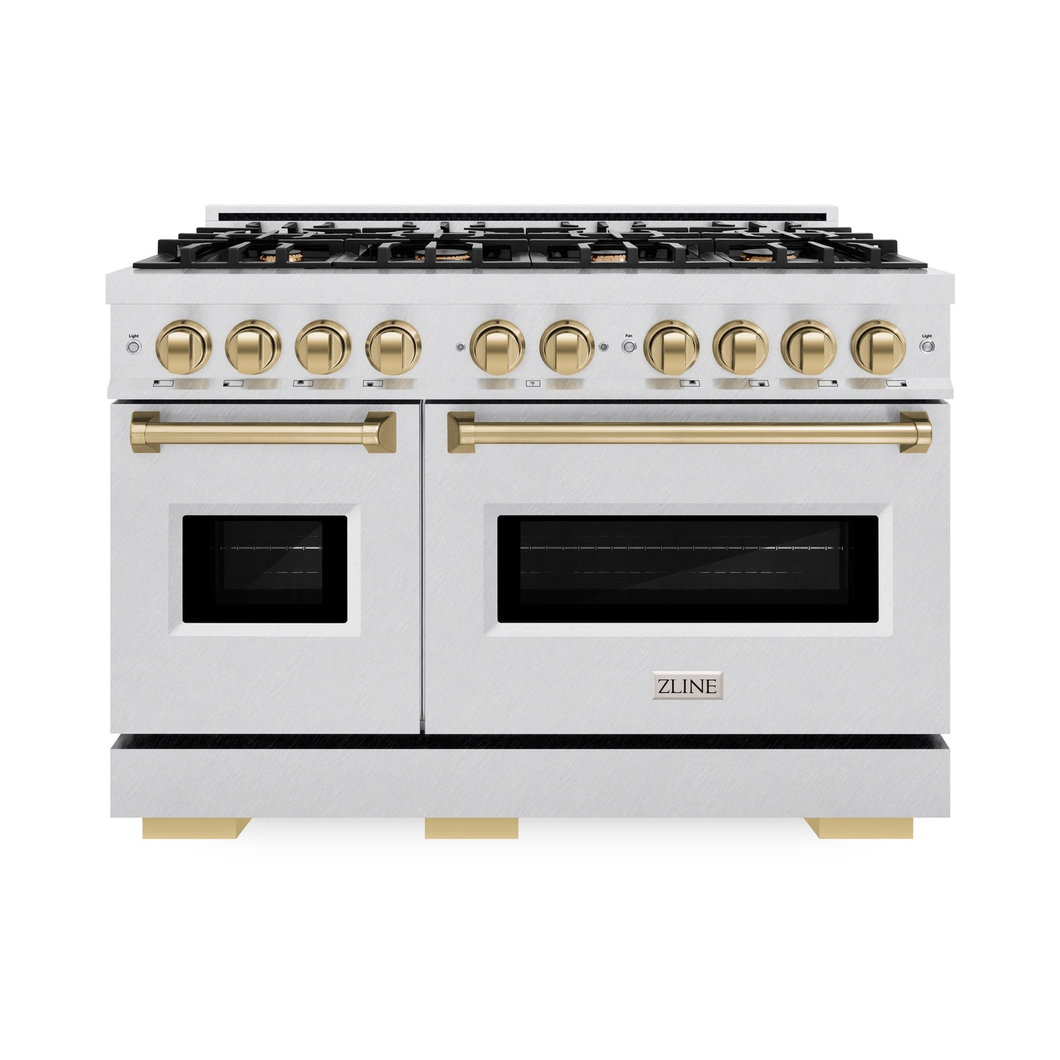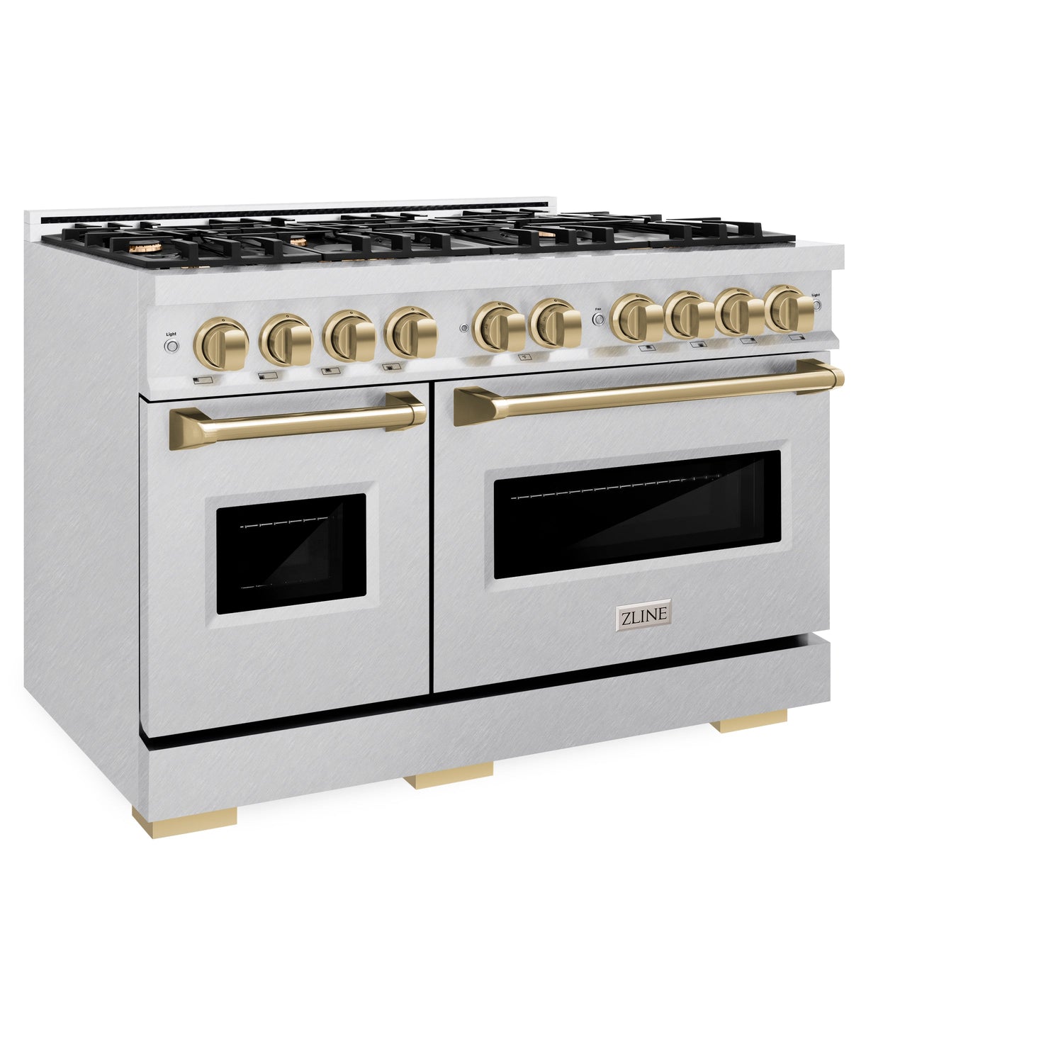 ZLINE Autograph Edition 48 in. 6.7 cu. ft. Classic Double Oven Dual Fuel Range with 8 Burner Gas Cooktop in Satin Stainless Steel and Champagne Bronze Accents (CDRSZ-48-CB)