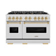 ZLINE Autograph Edition 48 in. 6.7 cu. ft. Classic Double Oven Dual Fuel Range with 8 Burner Gas Cooktop in Satin Stainless Steel and Polished Gold Accents (CDRSZ-48-G)