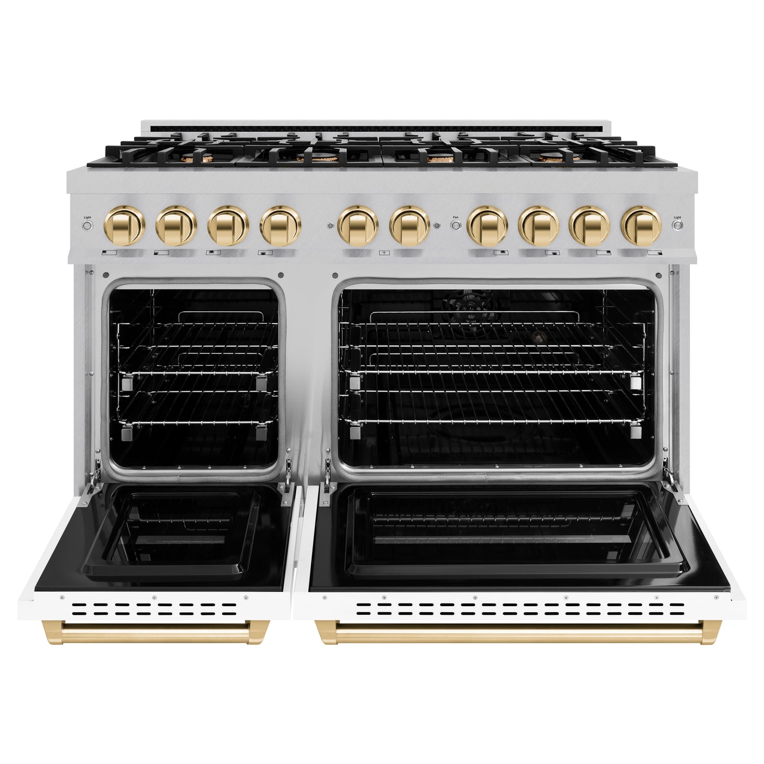 ZLINE Autograph Edition 48 in. 6.7 cu. ft. Classic Double Oven Dual Fuel Range with 8 Burner Gas Cooktop in Satin Stainless Steel with White Matte Doors and Polished Gold Accents (CDRSZ-WM-48-G)