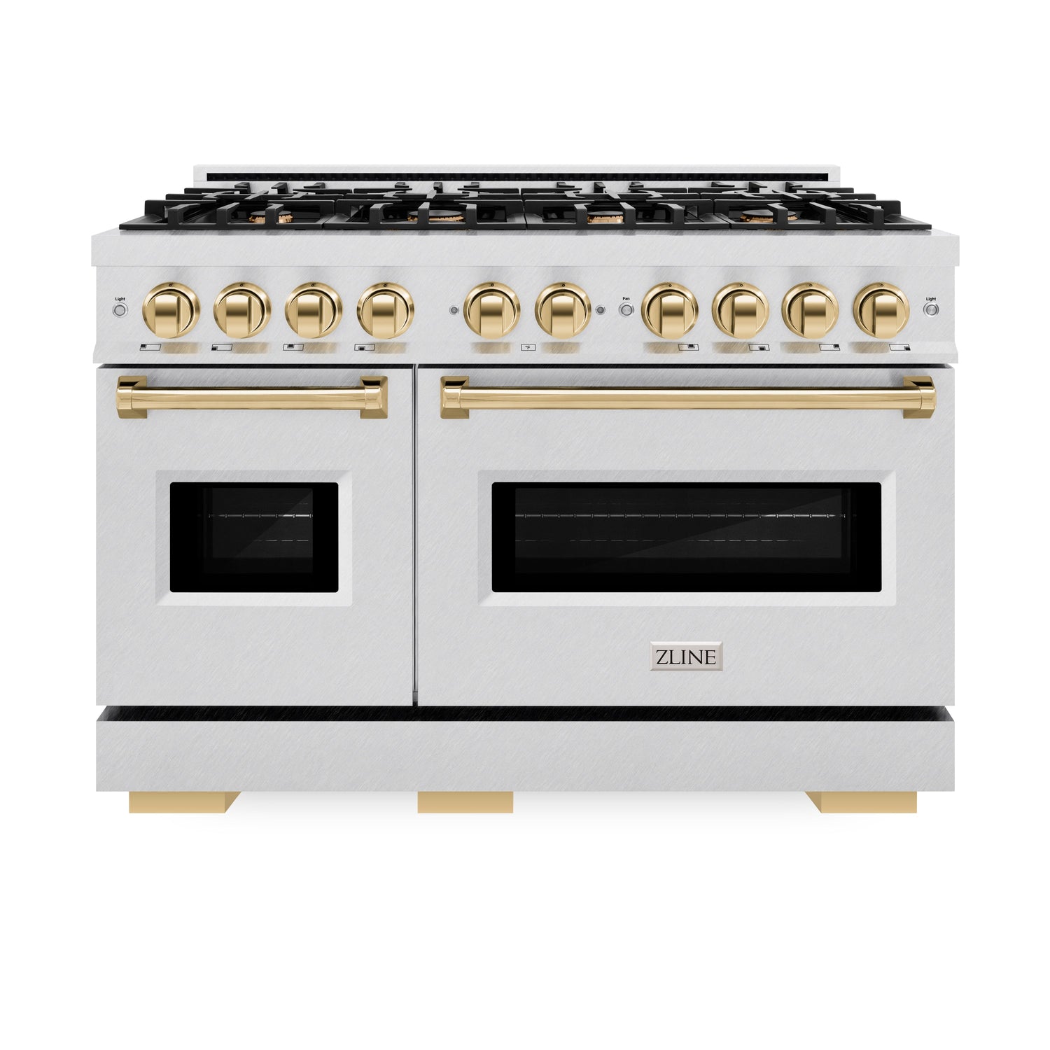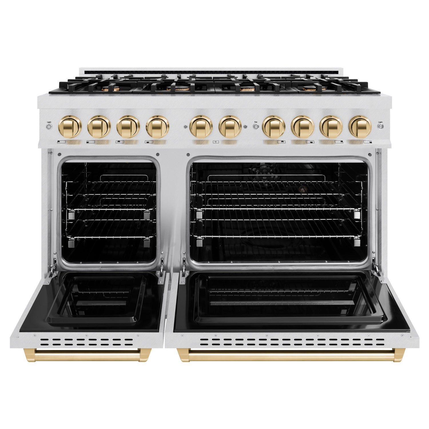 ZLINE Autograph Edition 48 in. 6.7 cu. ft. Classic Double Oven Gas Range with 8 Burner Cooktop in Satin Stainless Steel and Polished Gold Accents (CGRSZ-48-G)