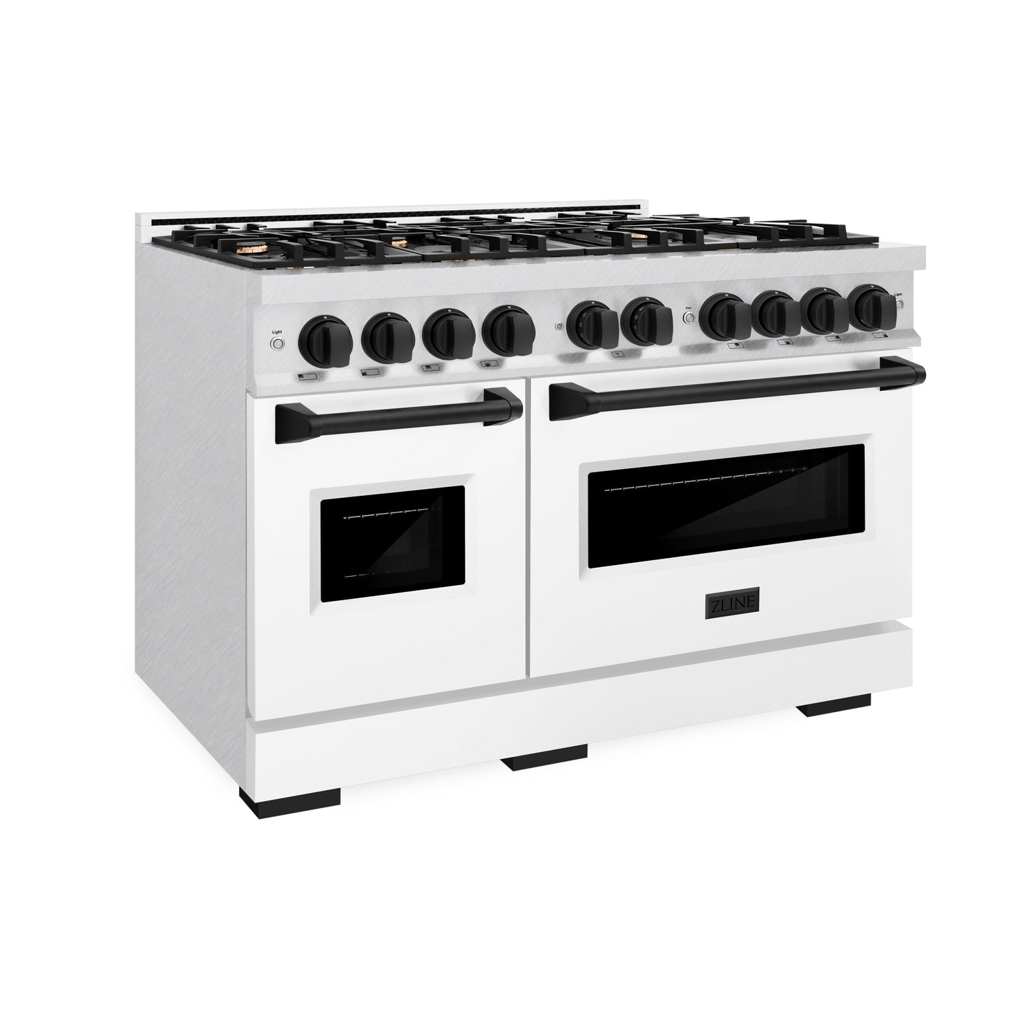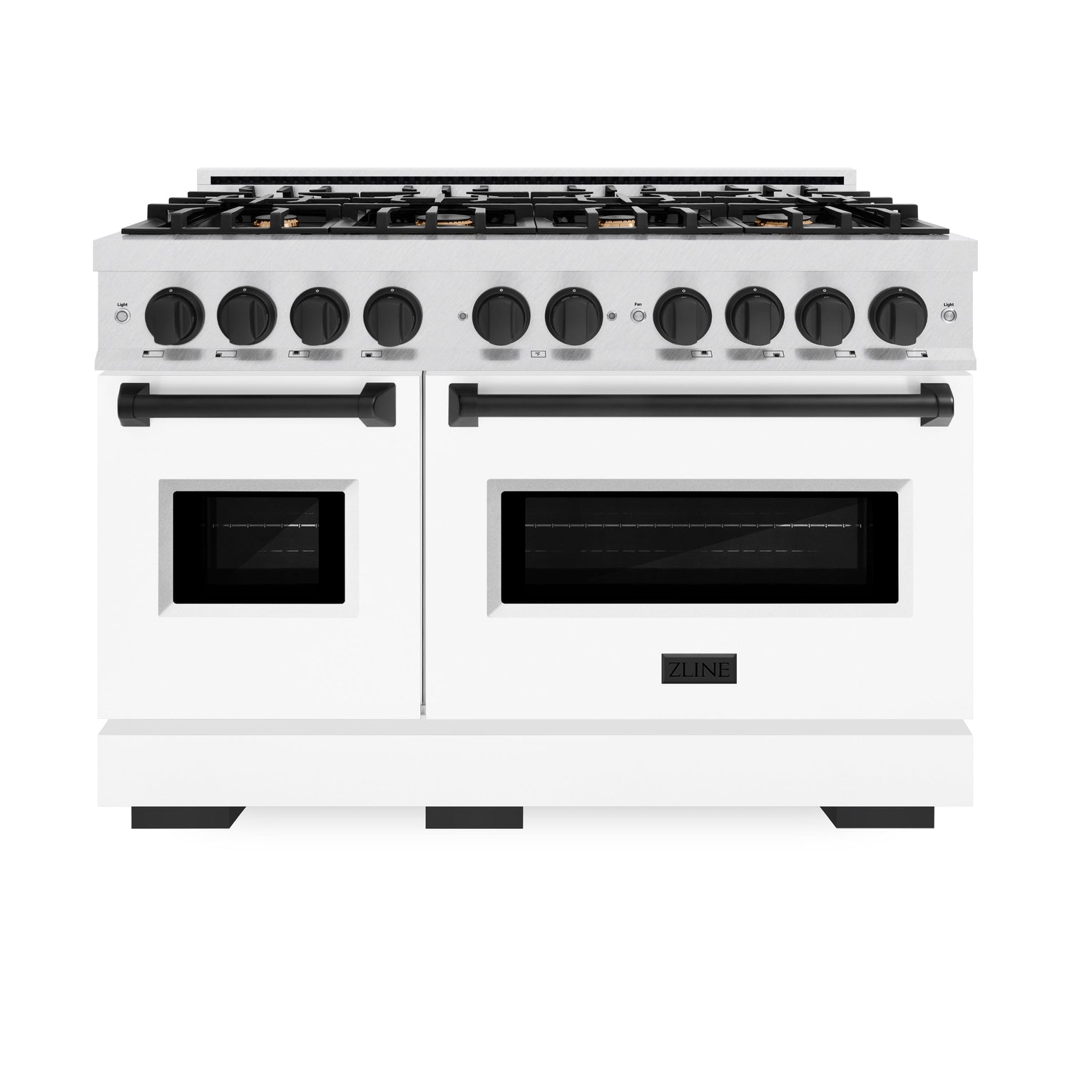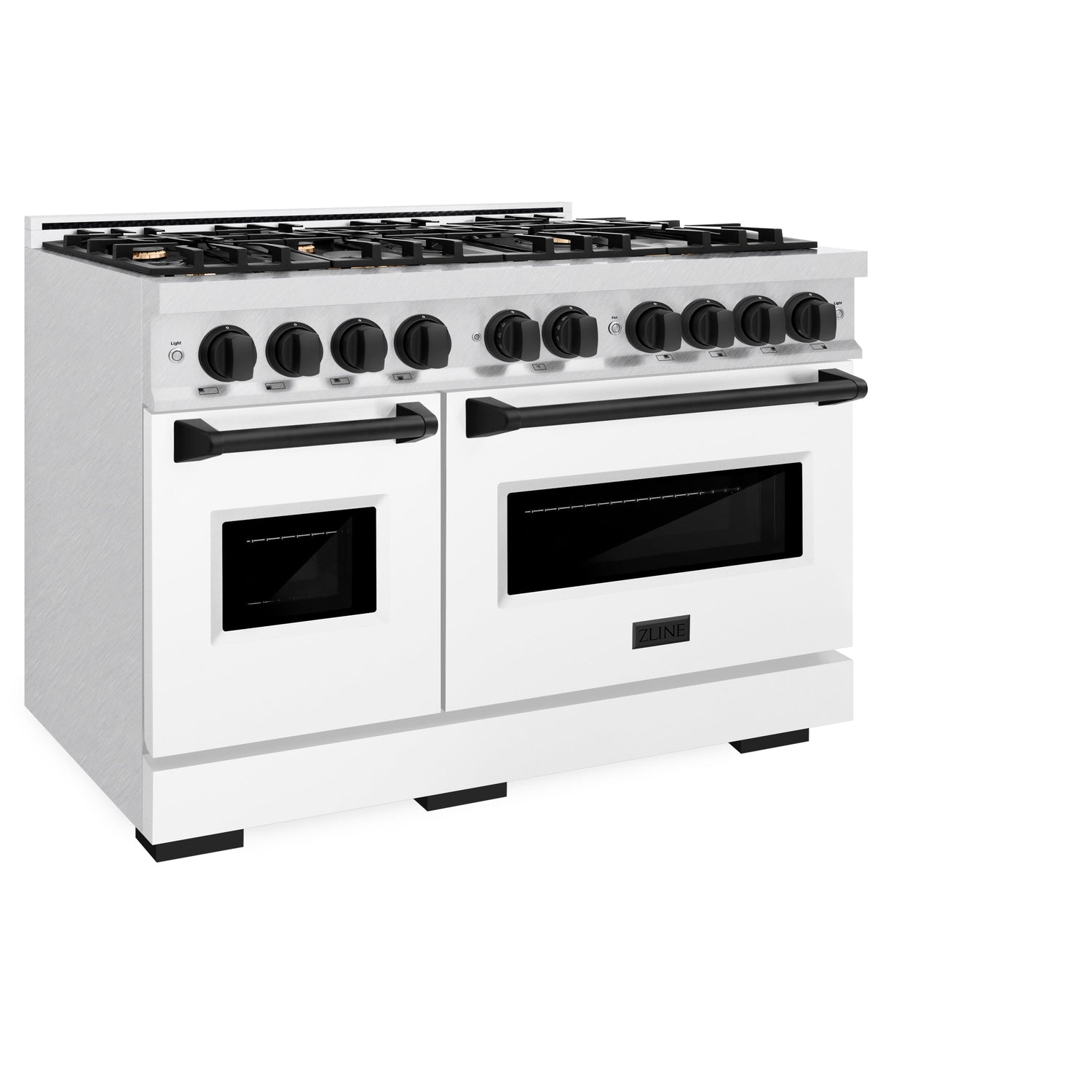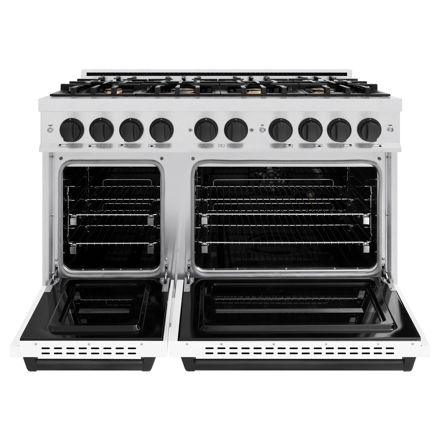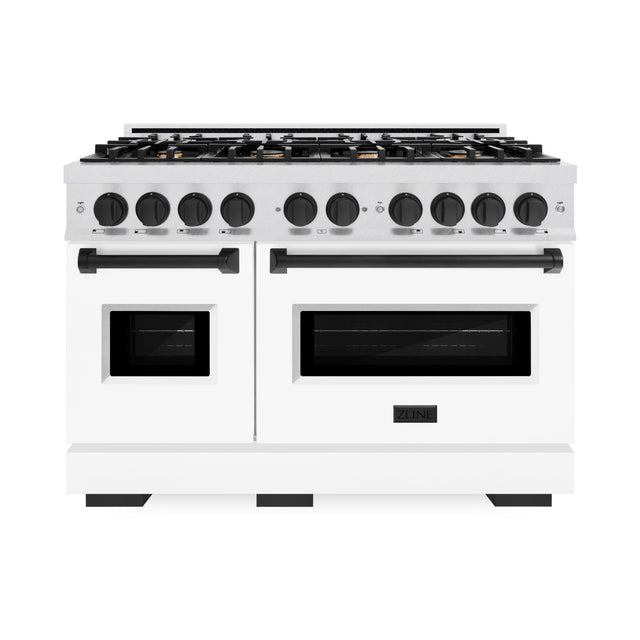ZLINE Autograph Edition 48 in. 6.7 cu. ft. Classic Double Oven Gas Range with 8 Burner Cooktop in Satin Stainless Steel with White Matte Doors and Matte Black Accents (CGRSZ-WM-48-MB)