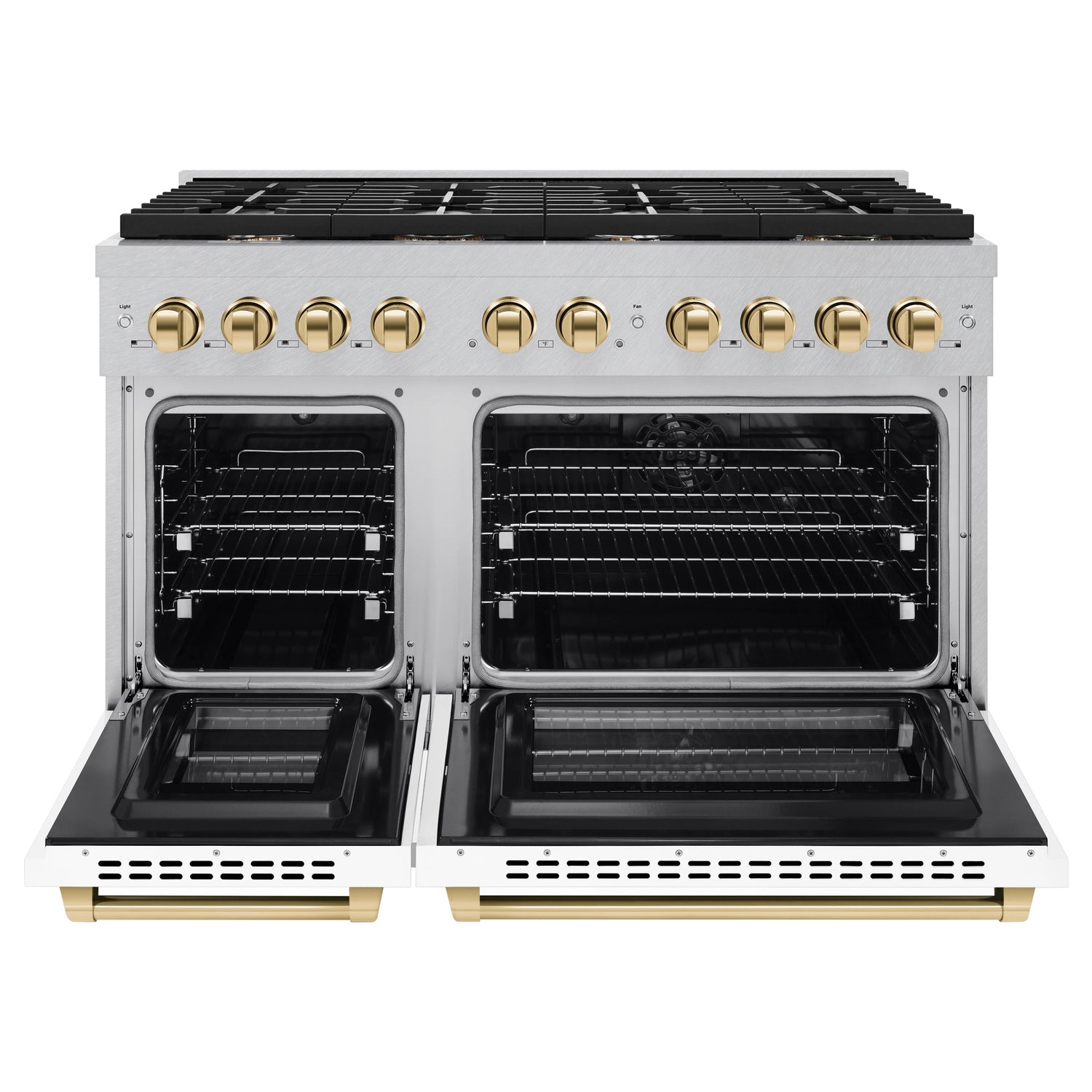ZLINE Autograph Edition 48 in. 6.7 cu. ft. Paramount Double Oven Dual Fuel Range with 8 Burner Gas Cooktop in Satin Stainless Steel with White Matte Doors and Polished Gold Accents (SDRSZ-WM-48-G)