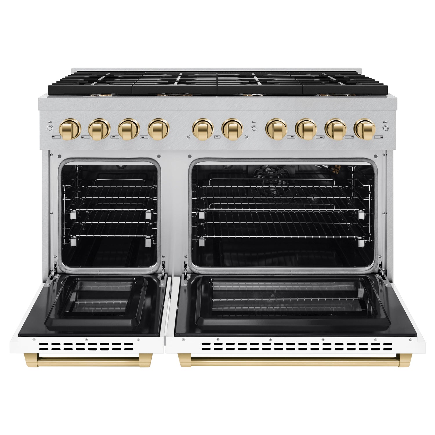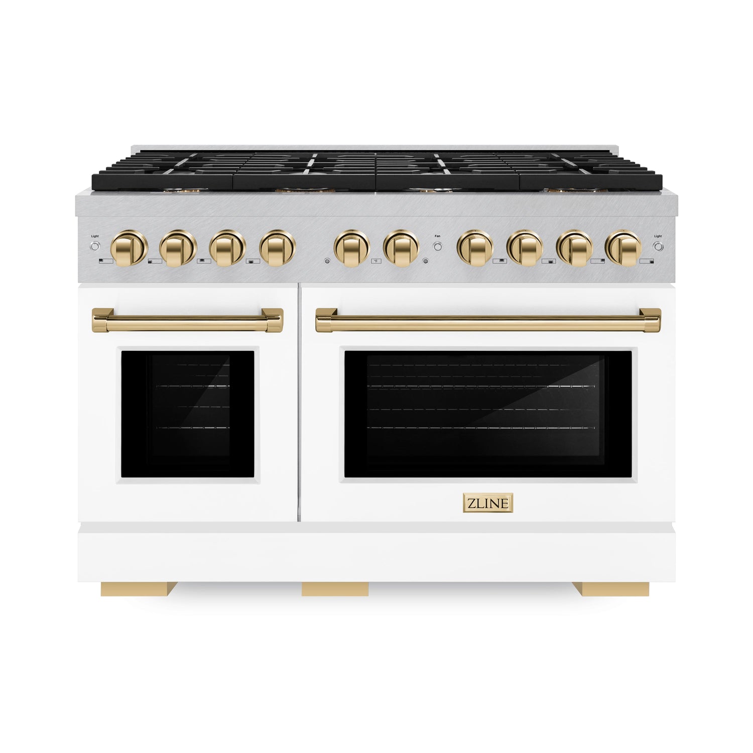 ZLINE Autograph Edition 48 in. 6.7 cu. ft. Paramount Double Oven Gas Range with 8 Burner Cooktop in Satin Stainless Steel with White Matte Doors and Polished Gold Accents (SGRSZ-WM-48-G)
