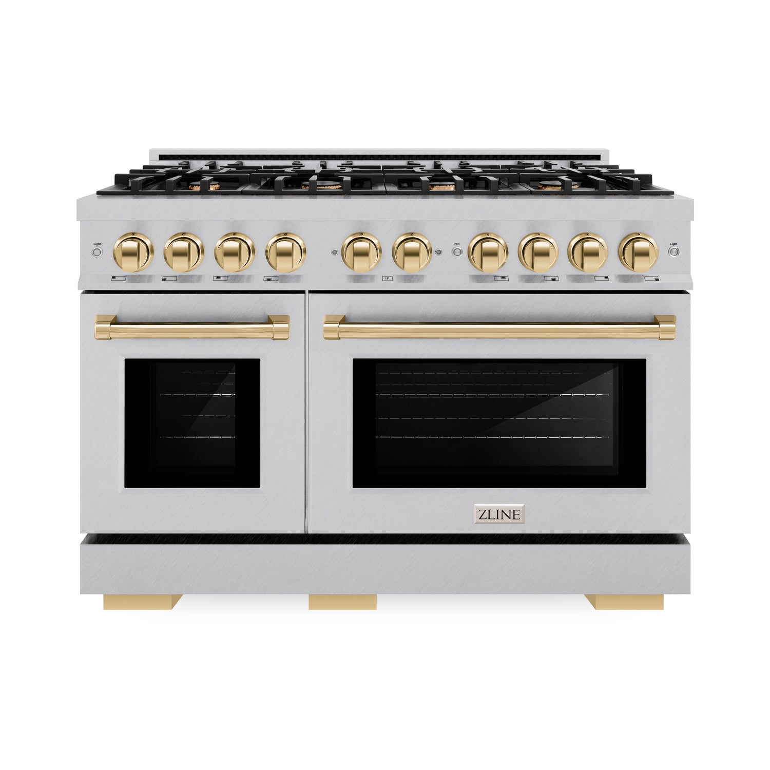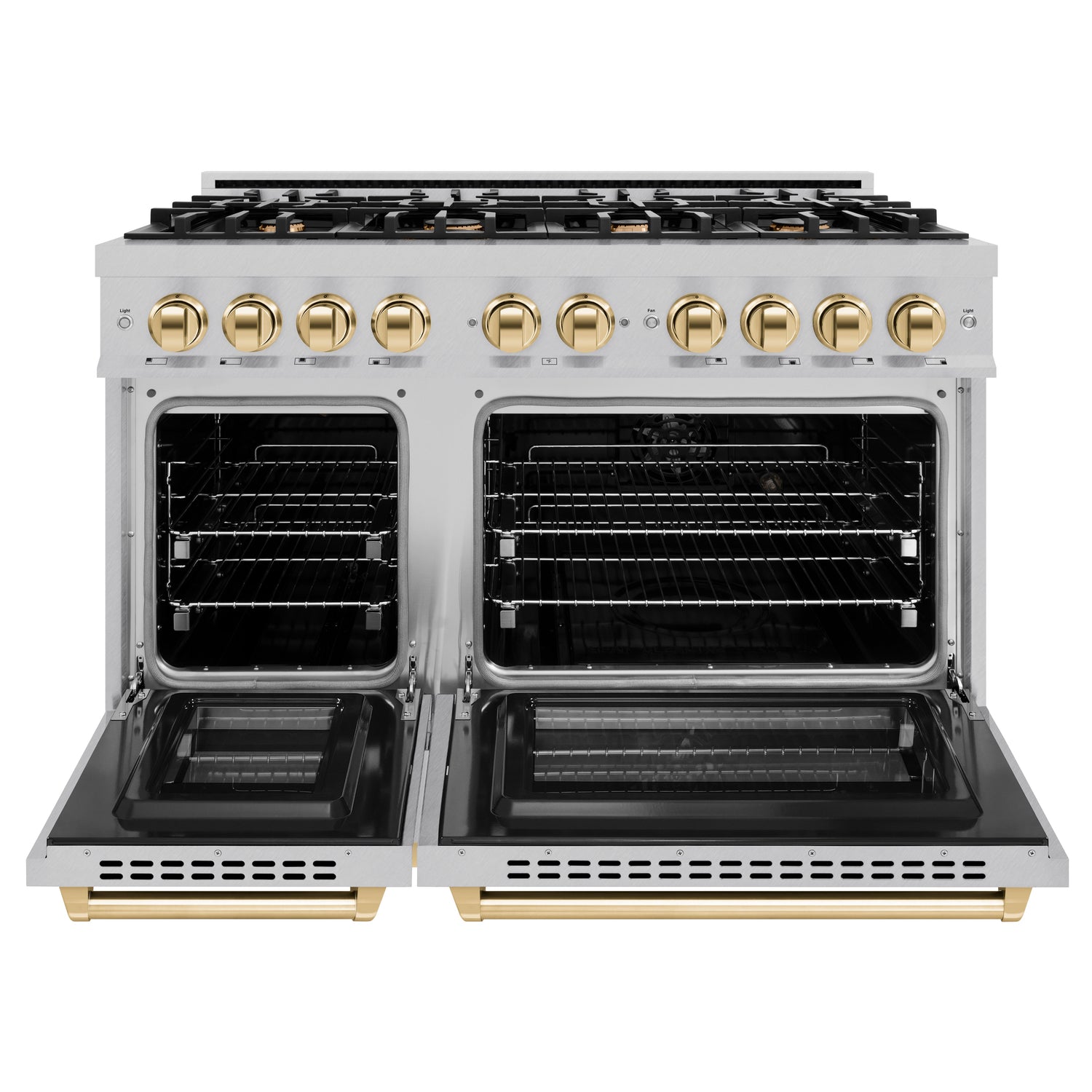 ZLINE Autograph Edition 48 in. 6.7 cu. ft. Select Double Oven Dual Fuel Range with 8 Burner Gas Cooktop in Satin Stainless Steel and Polished Gold Accents (HDRSZ-48-G)