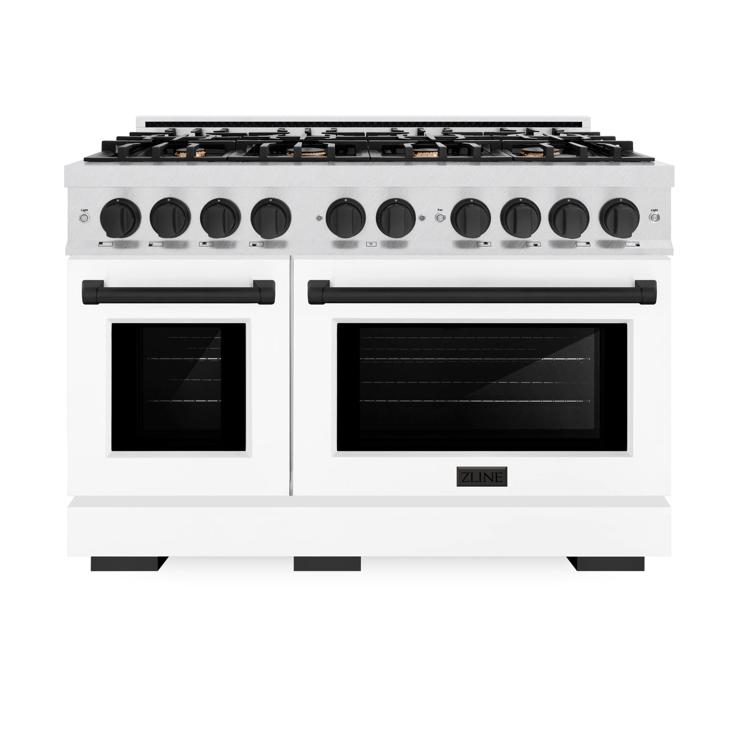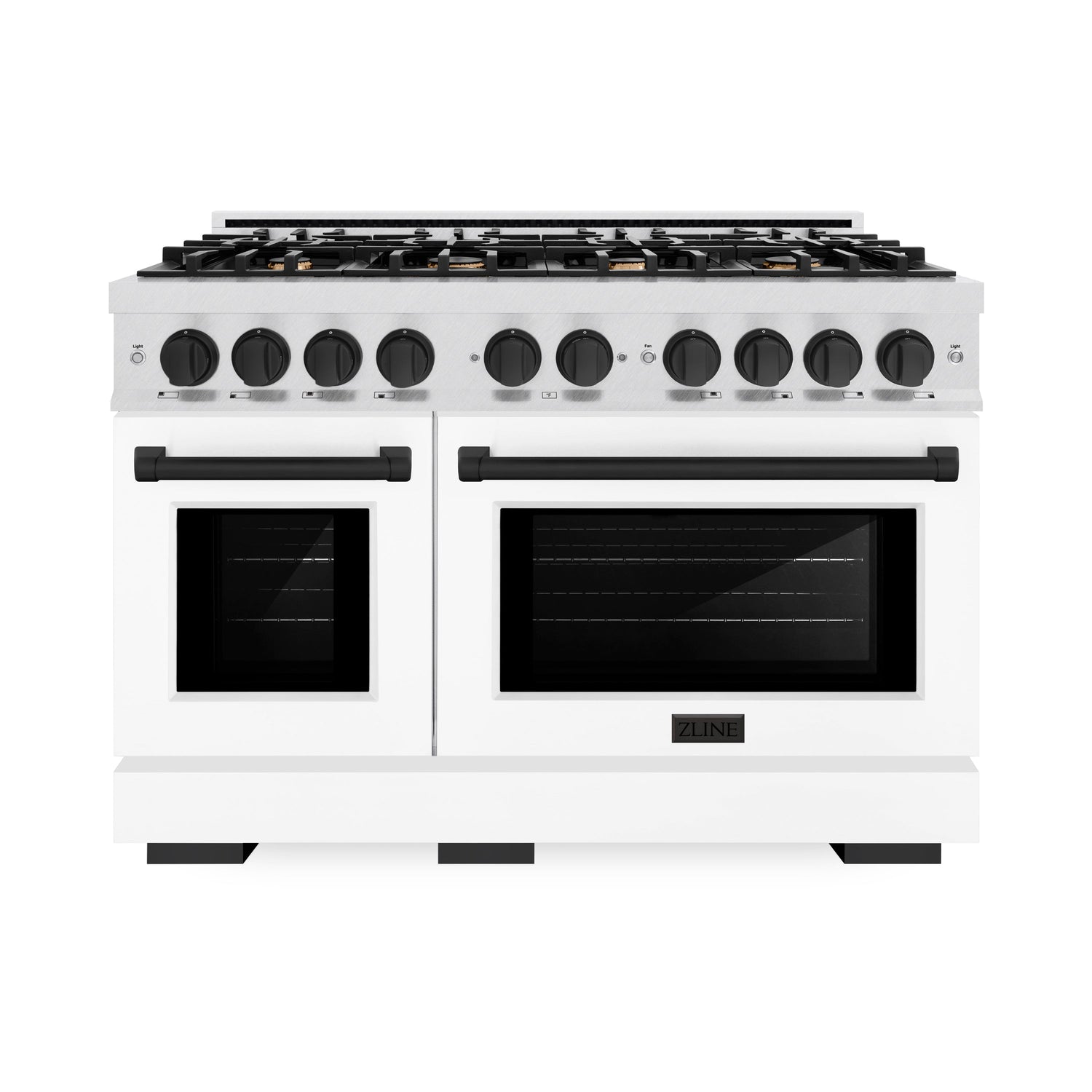 Luxury isn’t meant to be left desired—it’s meant to be attainable. The ZLINE Autograph Edition 48 in. 6.7 cu. ft. Select Double Oven Dual Fuel Range with 8 Burner Gas Cooktop in Satin Stainless Steel with White Matte Doors and Matte Black Accents (HDRSZ-WM-48-MB) combines the elegance of a hand-finished porcelain gas cooktop with 8 Italian-made auto-reignition burners, a large electric convection oven with an energy-efficient cooling fan to ensure quiet operation, a small bake-and-broil oven, beautiful white matte doors with Horizon window designs, and stunning matte black knobs and handles allowing you to master every meal. With a modern, timeless style and refined functionality, ZLINE Select Dual Fuel Ranges are masterfully crafted to deliver an elevated culinary experience.