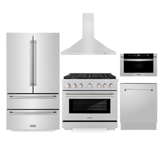 ZLINE Kitchen Package with Refrigeration, 36" Stainless Steel Gas Range, 36" Range Hood, Microwave Drawer, and 24" Tall Tub Dishwasher (5KPR-SGRRH36-MWDWV)