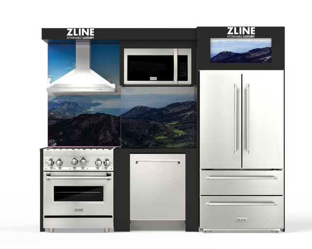 ZLINE Kitchen Vignette with a Stainless Steel Refrigerator, 36" Dual Fuel Freestanding Range, Stainless Steel Range Hood, 30" Over the Range Microwave, and Monument Style Dishwasher (VND-FCD-RA) is backordered and will ship as soon as it is back in stock.
